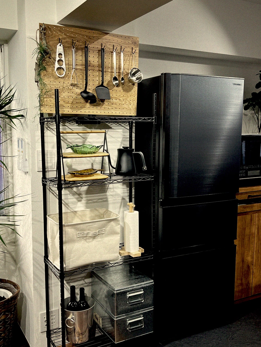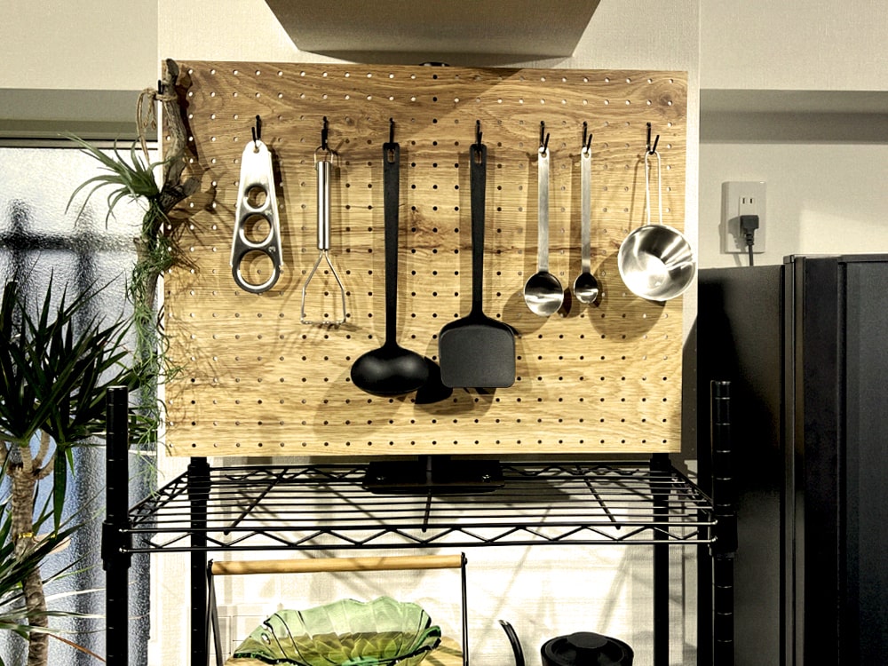 木製の有孔ボードならハードになりすぎず、観葉植物とも相性抜群。